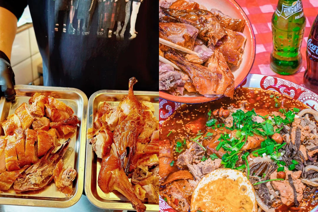 冒烤鸭是成都才有的吃法,起源于80年代,是农贸市场中接地气的市井美食。主打先“烤”后“冒”,烤鸭皮脆肉嫩、再用卤水汆烫,味道浸润在鸭肉里,搭配琳琅满目不同口感的配菜,就是一道荤素搭配的硬菜。