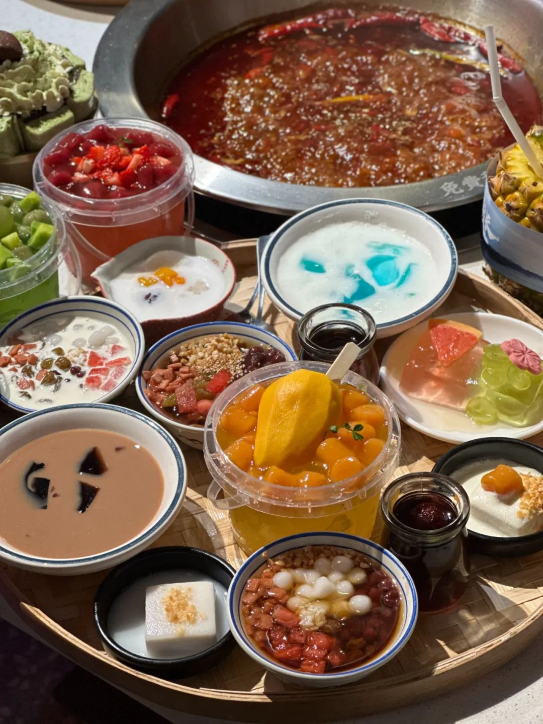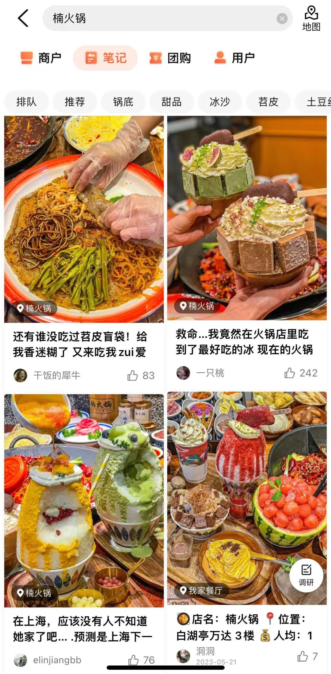 在小红书搜索“火锅甜品”,有超过52万篇相关笔记,映入眼帘的是各种花花绿绿、造型夸张的甜品。有网友晒出的照片中,除了锅底之外,桌上的甜品摆得满满当当的,被戏称为“在甜品店吃火锅”。在北京上学的小瑾第一次尝试楠火锅就是被它的甜品——青提雪山冰吸引。青提雪山冰高度十几厘米,椭圆柱形的雪山冰顶上用几颗青提和蓝莓装饰,用勺子挖开外层的冰沙,里面还有红豆沙、爆珠、仙草、冰粉等小料,从照片上看的确格外诱人。