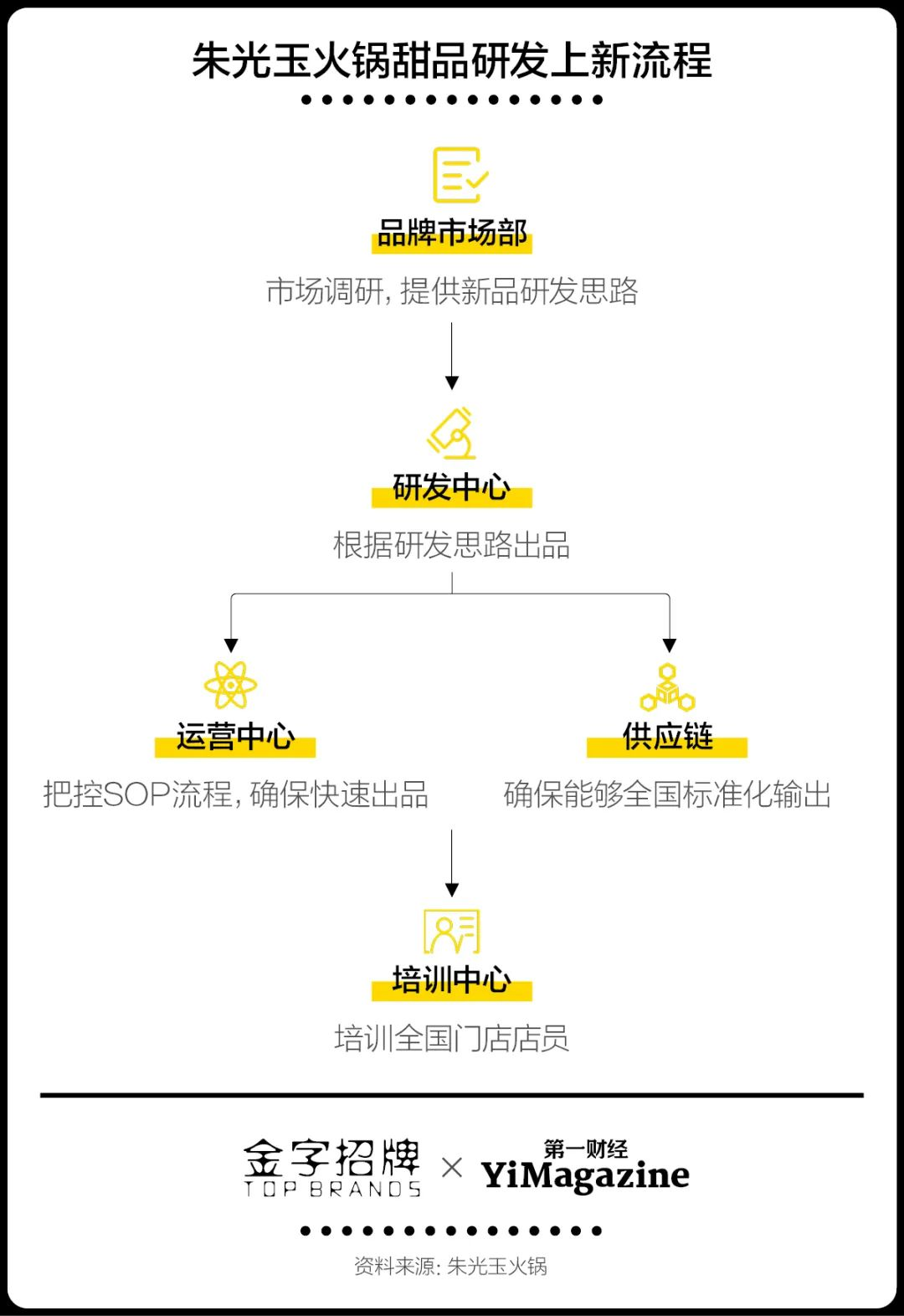 与此同时,小红书、抖音等主打图文和短视频的新媒体崛起助推了这一趋势,相比朴素的锅底和菜品,造型夸张、色泽鲜艳的甜品显然更好“出片”,也更加吸睛。2021年,当火锅店又掀起柠檬茶的热潮时,梁熙桐重新把目光聚焦在了甜品上,而他对甜品造型设计的要求就是“浮夸”。“要么是往大了做,要么是色彩很鲜艳,要么就是加一些独特的东西。”梁熙桐说。图文和短视频等新媒体的崛起让火锅店的甜品创作开始变“浮夸”。重八牛府的创始人杜坤在一次餐饮论坛中提出了“颜价值”的概念,即颜值对于餐饮店的价值。“边吃火锅边吃甜品,其实六成以上的人会拉肚子,但为什么大家还做甜品?很简单,因为它好看、好拍照。当今流量很贵,按我的计算,大概60块钱我才能买一个新人过来,这种情况下,颜价值就显得格外有意义。”梁熙桐很清楚自己要把这些高颜值的甜品卖给哪些人、在哪里卖。根据美团提供的经营画像报告,朱光玉火锅的消费者集中在20-35岁的年轻人群,且女性用户占比超过70%,而热衷拍照打卡正是这部分消费者的一大特点。针对目标消费者,朱光玉火锅的甜品推广瞄准了小红书而非抖音。“小红书的女性占比更高、种草性质更强,它的图片精美度也比短视频要高。”造型之外,火锅店甜品的另一个引流点在于价格。卤校长老火锅就以“甜品免费吃”为爆点,冰粉、冰汤圆类、杨枝甘露、奶茶烧仙草等共12种基础甜品均可免费自取。卤校长老火锅北京西单老佛爷店的负责人段吉成最初加盟时对甜品免费的模式也有所顾虑,但最终认同这是品牌的一大优势。“现在做餐饮很难,没有自己的特点和优势很难生存。”段吉成对《第一财经》YiMagazine说。为了保持对消费者的新鲜感和吸引力,火锅店为甜品开发绞尽脑汁。4月初接受采访时,段吉成就已经在测评各种甘蔗和茅草根的口味,准备夏季上新的饮品和甜品了。段吉成还想找灭火器样式的饮料包装瓶,“看上去比较震撼,也有灭火的含义。”朱光玉火锅每个季度上新十多个产品,今年第一季度上新时,12个新品中甜品就有5个。在梁熙桐看来,饮品和甜品的流行趋势每年都在变化,去年流行的是造型浮夸且精美的牛乳冰系列,今年流行的则是冰汤圆、芋泥桶等更具街头小吃气息的甜品。因此,品牌需要根据流行趋势不断更新产品。据黄薰毅观察,传统火锅店一般以主菜而非甜品为重点,因此大多数品牌的甜品仍由原有的采购、研发、主厨等负责,且研发思路相对保守,而新一代主打甜品的网红火锅店往往有专门的团队负责甜品研发,或是交给专业的第三方代理商负责。朱光玉火锅的新品研发采用“4+1”的配置,即由公司的品牌市场部、研发中心、运营中心、培训中心协作,并与供应链公司配合。品牌市场部经过市场调研后提供甜品的造型、口味等研发思路,再由研发中心负责执行和呈现,运营中心需要考察和把控SOP流程,确保能够快速出品,并由供应链公司解决全国标准化输出的问题,最终交由培训中心向全国各门店店员培训。