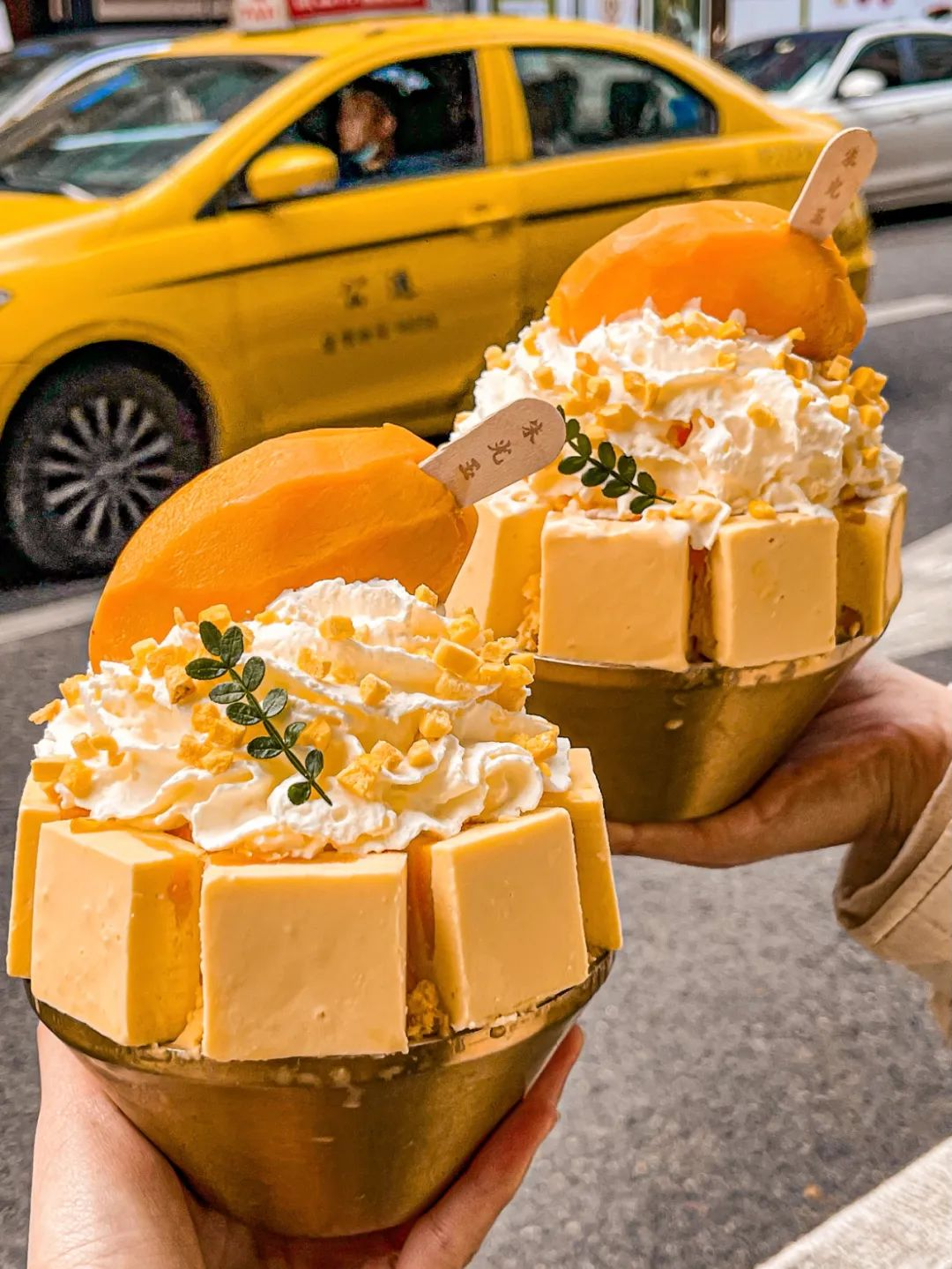 朱光玉火锅最为畅销的甜品是“牛乳冰”系列,该系列以奶冰为基底,上面添加喷射奶油“垫高”以增强视觉效果,四周围着一圈厚切酸奶块,最后再在最上方插上一根梦龙雪糕或是放上满满的水果,“提升价值感”。牛乳冰的口味则选择芒果、抹茶、西瓜等,正好是黄色、绿色、红色几种鲜艳的颜色。