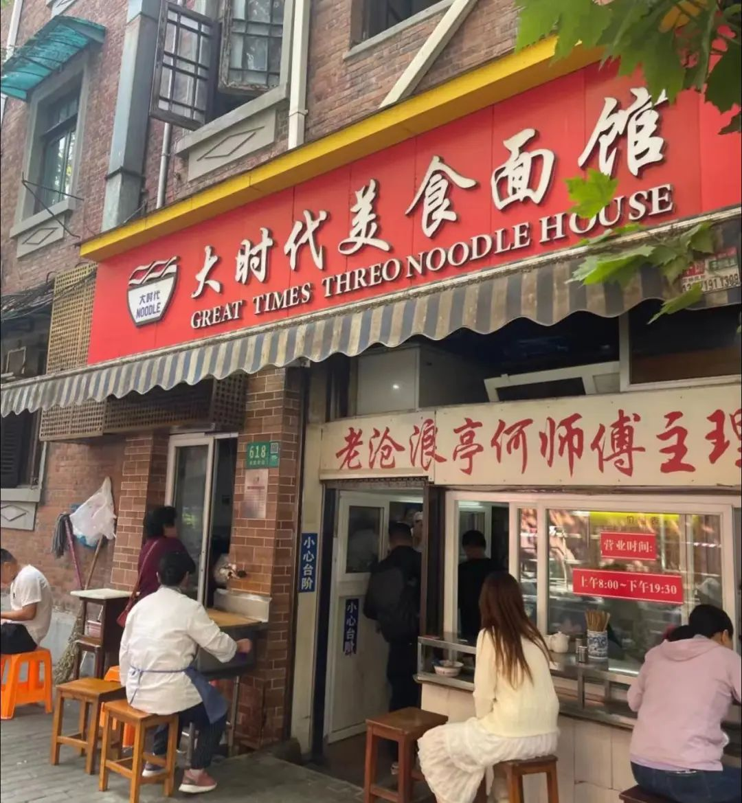 例如,在距离新天地步行10分钟的黄陂南路上,有一家名为「大时代美食面馆」的店,是我的私藏面馆,店面极小,周边几乎已经不留其他店面,只有它一直还在,号称是「沧浪亭面点师」,此前生意都还算不错,但不会到大排长龙;今年再去,马路上的队伍已经是里外三层,好在大家吃得快,排队速度也不慢。