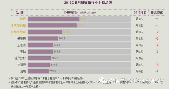 根据工信部中国企业品牌力研究中心颁发的,“2013年中国品牌力指数”(China Brand Power Index简称CBPI)的报告中显示,2013年中国润喉糖市场畅销的9大品牌中,荷氏、绿箭、京都念慈庵名列前三名,其余品牌紧随其后。从图表中不难看出,具有保健功能的产品品牌上升较快,其中以京都念慈庵、王老吉和徐福记的上升最快。
