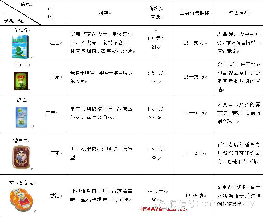 就目前而言,消费者可以在超市里买到各种品牌的润喉糖,包括 “川贝枇杷润喉糖”、“王老吉润喉糖”、“京都念慈庵”、“潘高寿润喉糖”……大部分产品的产品介绍上标有,产品采用现代中药提取技术,选自药食同源的纯天然植物配方制成,适合长期用嗓、经常性用嗓过度、应酬多,感冒或其他疾病引起咽喉不适人群,有别于其他普通润喉糖。不论是传统渠道,还是网络等新兴渠道,其中以主打保健功效的润喉糖产品最受消费者关注。