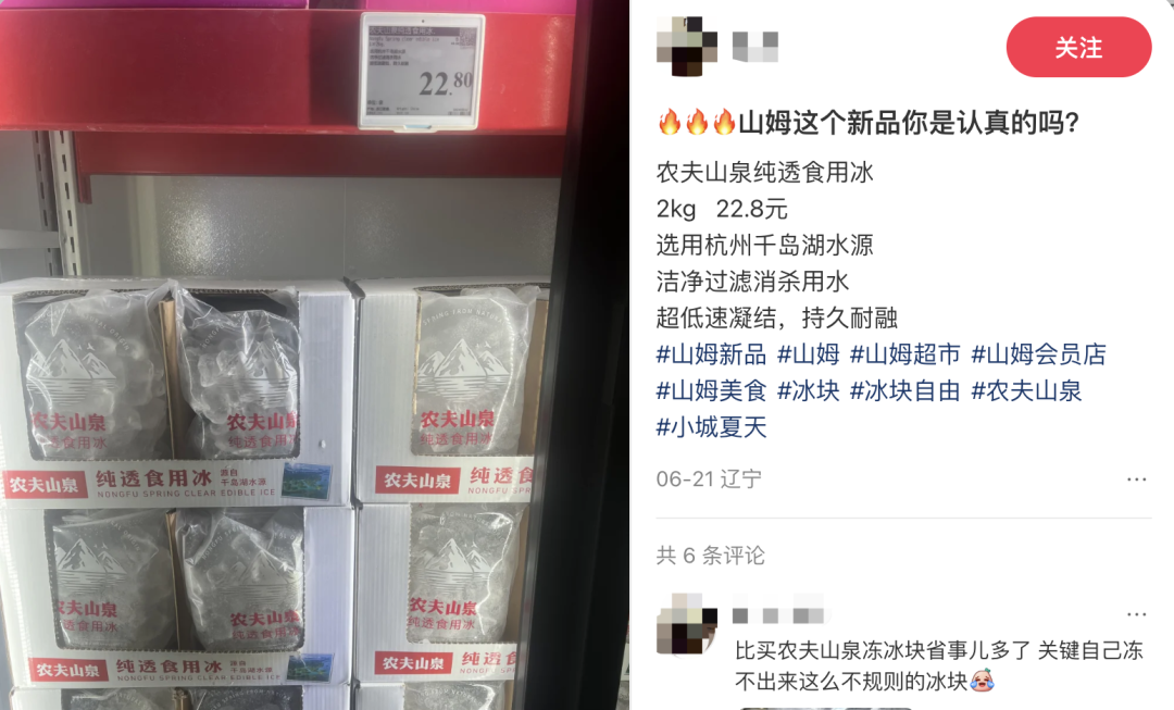 “是我颠了吗?山姆新品上了农夫山泉冰块”、“山姆这个新品你是认真的吗?”