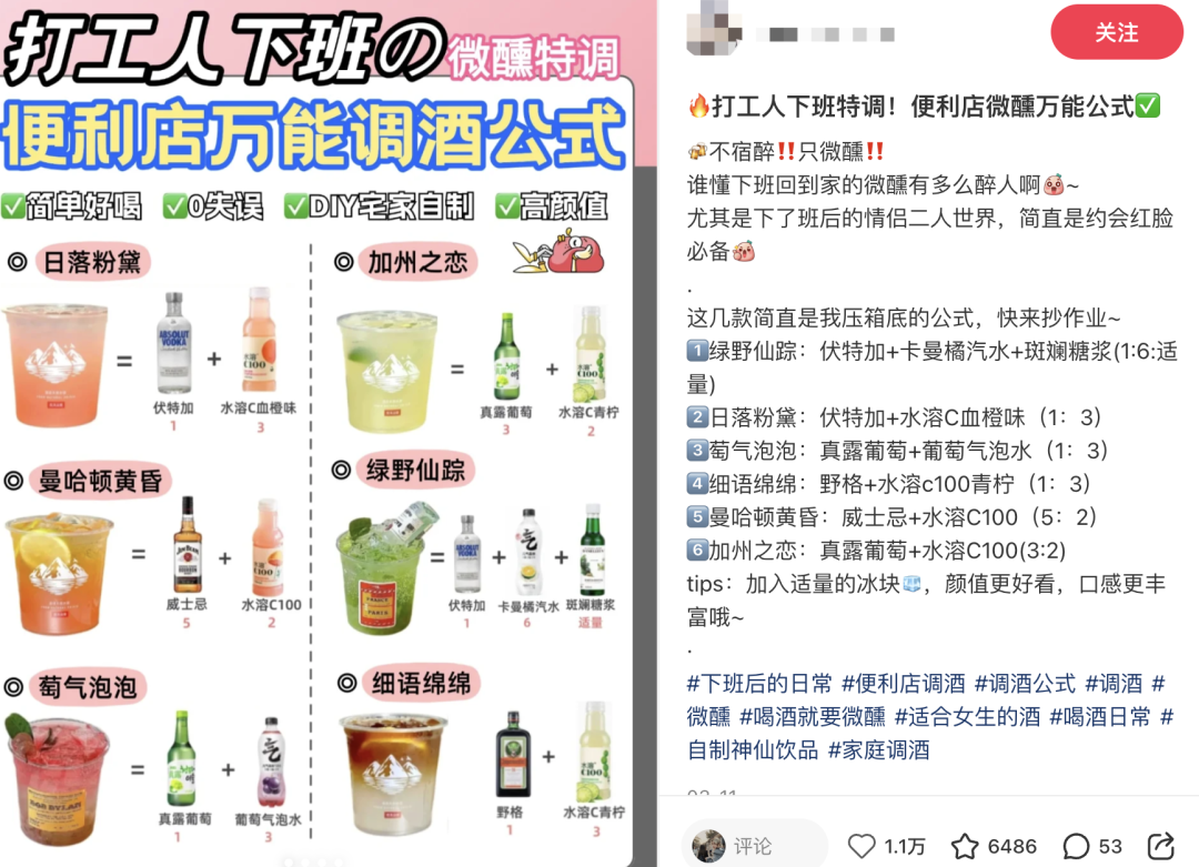 “冰杯+威士忌/伏特加+饮料”作为便利店微醺万能特调公式,DIY出打工人下班微醺特调鸡尾酒。