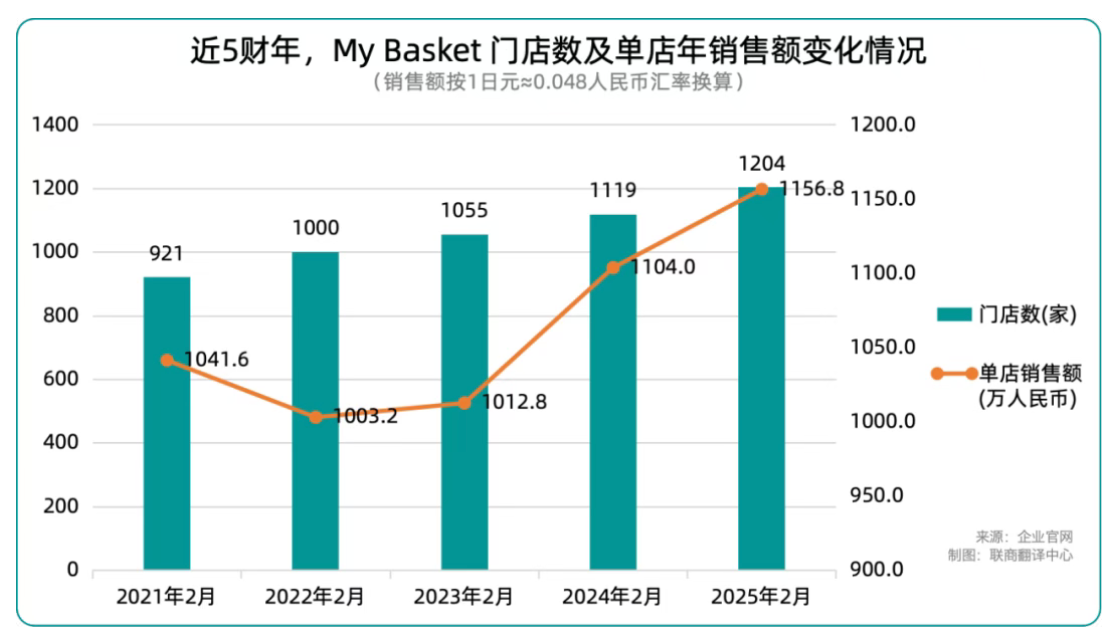 截至2025年8月,My Basket门店数达1264家,较2021年净增343家,五年增长37%。单店年销售额从2021财年的2.17亿日元(约1042万人民币)提升至2024财年的2.41亿日元(约1157万人民币),超过2亿日元的水平在日本食品零售行业中属于高绩效标准。