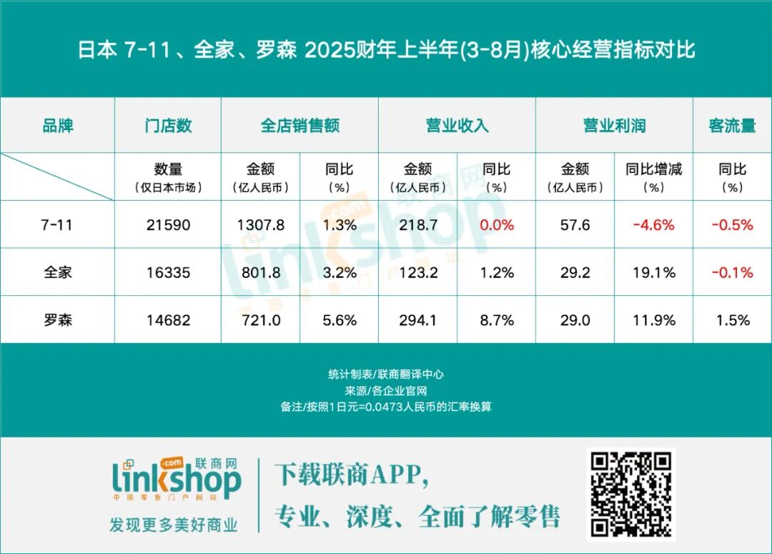 问题在于,作为集团主心骨的日本7-11业务仍在“失速”。尽管客单价与同店销售额保持增长,但客流量始终未能“止跌”。反观竞争对手,罗森与全家展现出了更强的增长势头。它们不仅在同期实现了营业利润的“双位数”增长,单店日销售额也同步升至约2.85万元,进一步缩小了与7-11(约3.3万元)的差距。