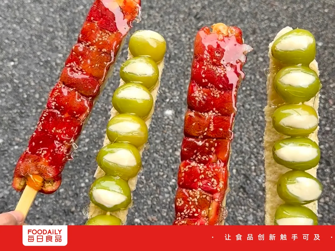 说到这,很多人可能会疑惑,奶皮子糖葫芦到底又是什么新物种啊?其实,奶皮子糖葫芦就是在基础款的糖葫芦外层贴上一层奶皮子,有的商家还会推出一些更具有“层次感”和创意的食材组合,比如在水果中间夹干噎酸奶,或用阳光玫瑰、无花果、草莓等高价值感、高颜值的水果代替传统的山楂,也因此造成了价格下至25上至98,参差不齐。