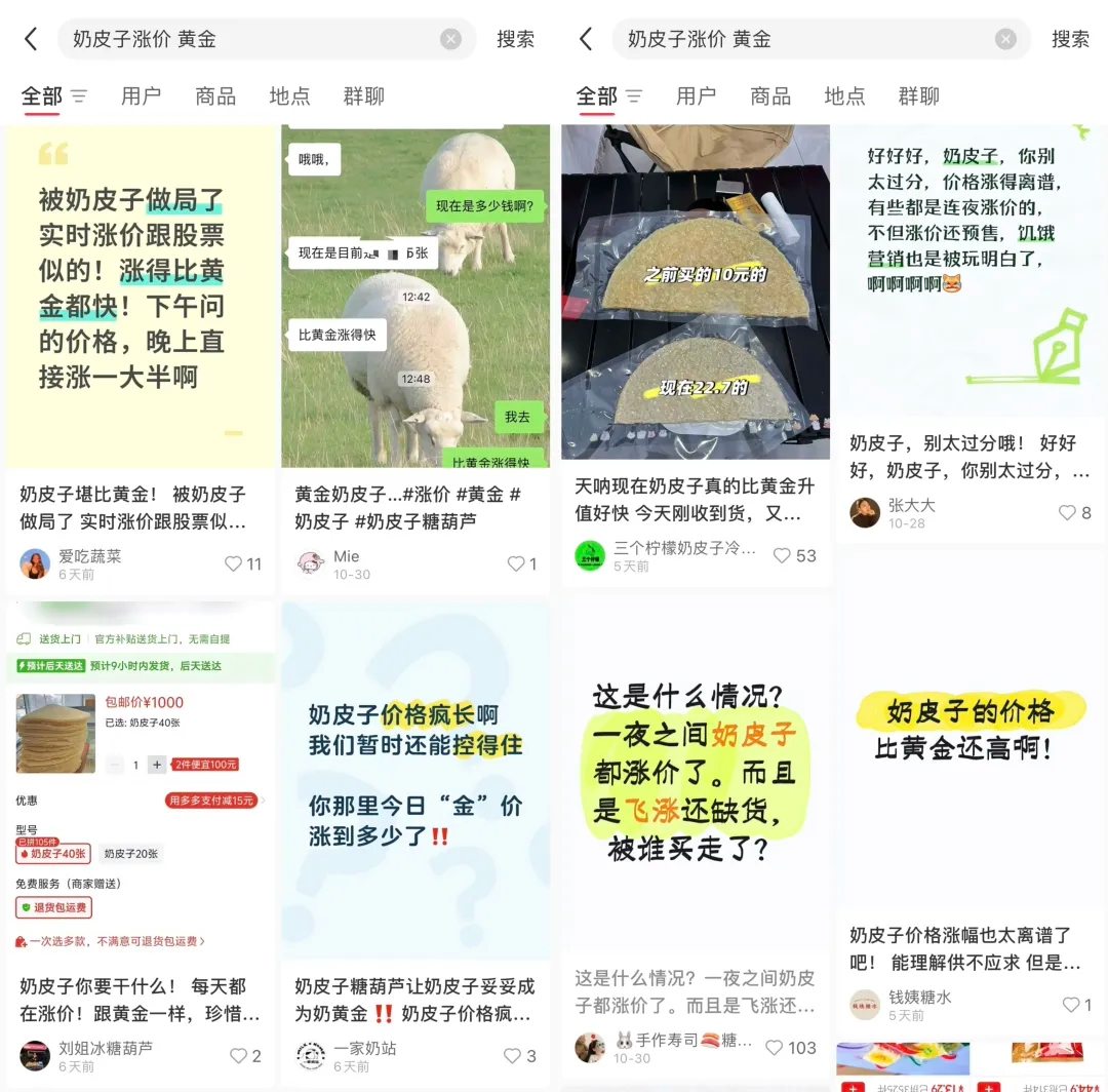这一爆品还直接导致了奶皮子供不应求,一边是奶皮子糖葫芦商家发帖问:“到底发生什么事儿了?奶皮子一夜之间涨价,涨得比黄金还快!”一边是奶皮子供应商发帖问:“到底发生什么事儿了?一个礼拜火的一塌糊涂,现在一天卖过去一个月的,完全供不上货了!”