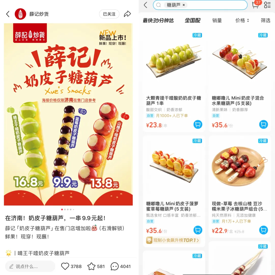 除了散落在各个城市的糖葫芦小店,盒马、薛记炒货的部分门店火速跟进,陆续上线了奶皮子糖葫芦。