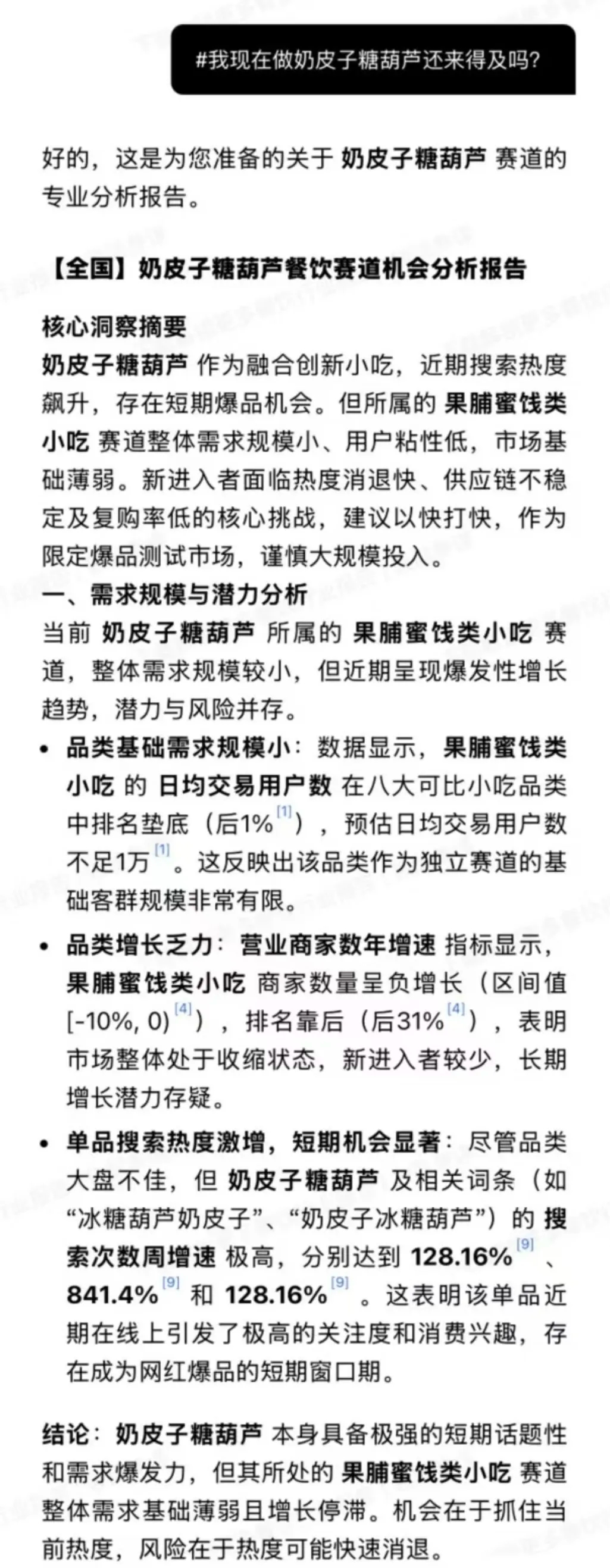关于这一判断也十分有争议,美团推出的AI智能运营辅助工具——袋鼠参谋给出了一份赛道机会分析报告,其中提到奶皮子糖葫芦属于果脯蜜饯类小吃赛道,整体需求规模小,用户粘性低,市场基础薄弱,新进入者面临热度消退快、供应链不稳定及复购率低的核心挑战。