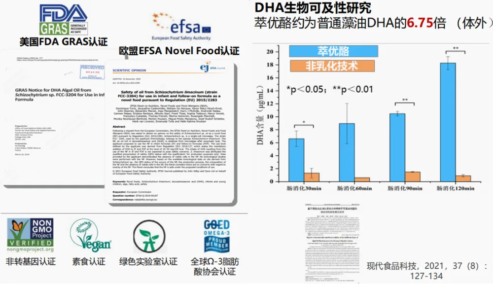 比如某款应用DHA藻油萃优酪的产品在原料认证和制剂的对比实验中,清晰直观地给到了相关佐证,将产品与普通藻油DHA对比,展现出鲜明的高倍数对比。