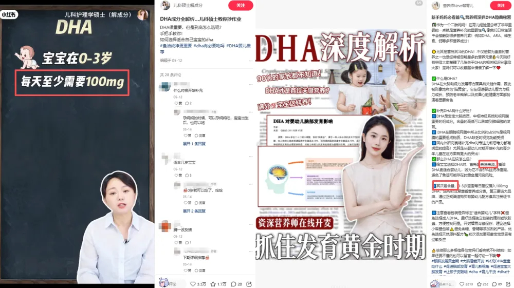 另一方面,国民健康认知不断加深,越发注重可靠权威的实验数据与专利背书。以消费者常用的DHA为例,在小红书上,DHA测评、DHA产品筛选等相关科普内容引发数万人讨论。越来越“懂”的他们,不止关注这一成分,还会主动对比其专利、摄入量、吸收率等信息,核实产品的健康功效性。