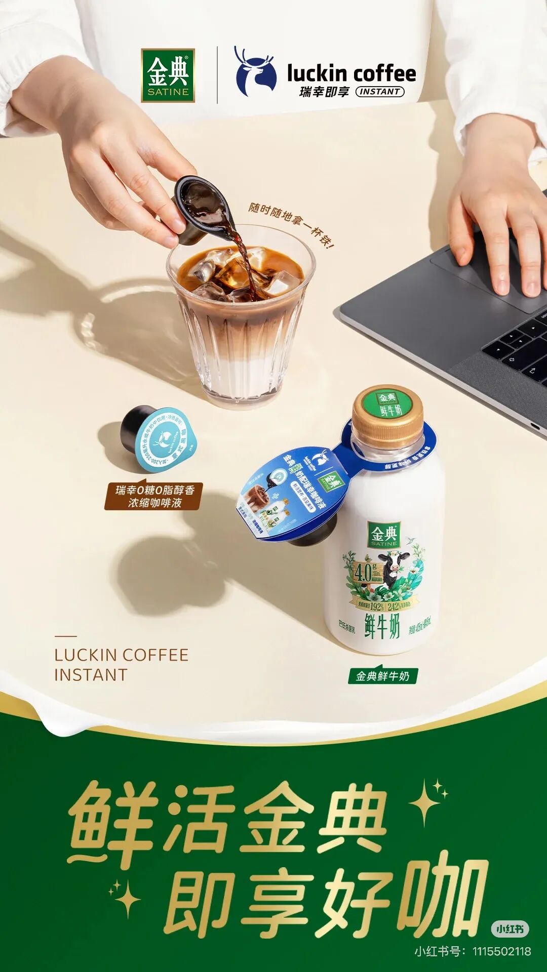 不仅如此,牛奶品牌的这个创意也给咖啡品牌提供了机会,这不金典就和瑞幸即享咖啡联名了,瑞幸浓缩咖啡液搭配金典4.0鲜牛奶活动陆续在北京、上海、广州、深圳、杭州等300+城市近5000家商超陆续上线,买鲜牛奶限时送咖啡液。