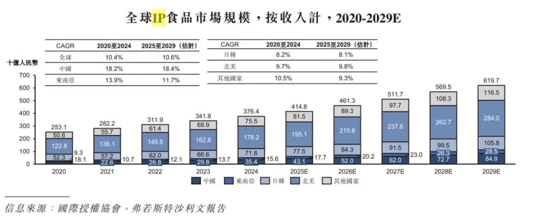 据弗若斯特沙利文的研究报告,全球IP食品市场正经历快速增长期,市场规模从2020年的2531亿元攀升至2024年的3764亿元,年复合增长率达10.4%。