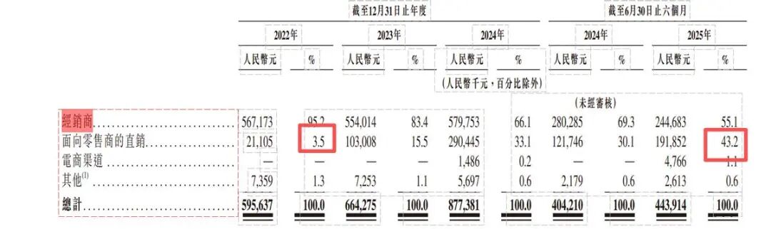 据招股书显示,零售商渠道的营收贡献从2022年的3.5%跃升至2025年上半年的43.2%,彻底重塑了企业的销售骨架。