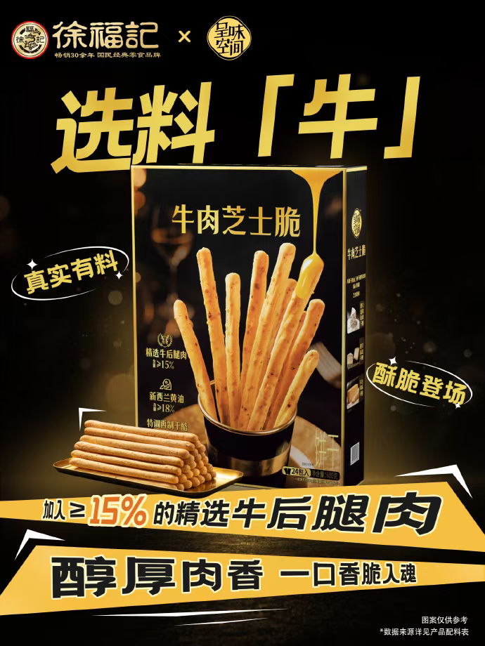 徐福记不仅早早筹备新年糖这一重要领域,还时刻谨记“全面发展休闲零食品类”,近日又推出牛肉芝士脆这一跨界新品。