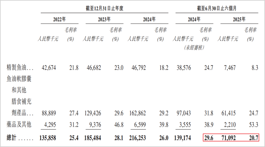 招股书显示,2018年以来国内毛鱼油成本进入了快速增长通道,2023年及2024年受到南美洲收紧捕捞配额及终端产品需求增加影响,成本单价达到了66元/千克以上,预估2025年会大幅回落。而毛利率大降更多源自此前采购的高价原材料。