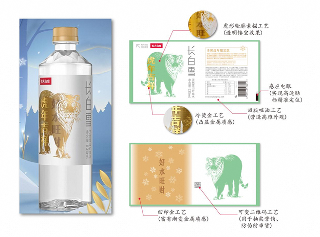 以农夫山泉长白雪虎年限量版矿泉水标签为例,江天科技应用柔印为主、凹印为辅的组合印刷技术,并结合轮廓素描、冷烫金色、上油(过哑油)、可变二维码喷码等工艺,实现了精美的印刷效果,突出了产品虎年定位、新颖独特的亮点。