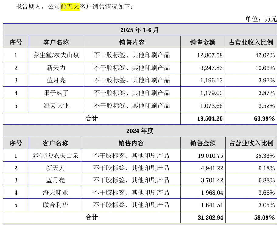 打开江天科技的客户名单,不难发现,第一大客户的养生堂/农夫山泉(农夫山泉系养生堂控股子公司)为江天科技撑起了一片天。2022年至2025年上半年,养生堂/农夫山泉的销售金额分别为1.13亿元、2.05亿元、1.90亿元和1.28亿元,占营收比例分别为29.40%、40.29%、35.33%和42.02%。