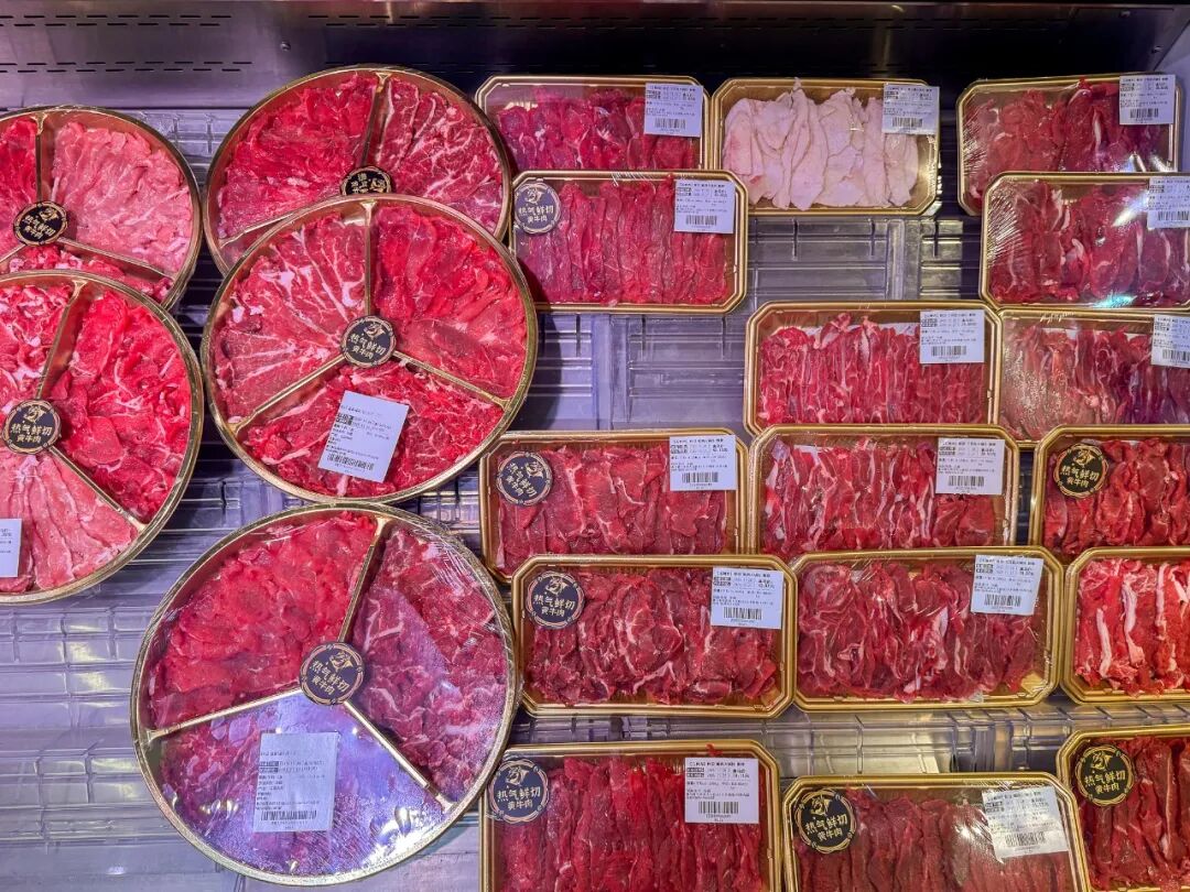 海鲜区扫荡完毕,抓紧转战肉品区:现切鲜肉泛着诱人光泽,冰鲜柜里整齐排列着各式牛肉卷,国产的、进口的,从基础款到M2级澳洲和牛,丰俭由人。想省事的话,足斤速冻羊肉三拼不到50块就能拿下。若赶上秒杀,配料表干净到95%都是虾肉的虾滑,15块一包直接实现“虾滑自由”。