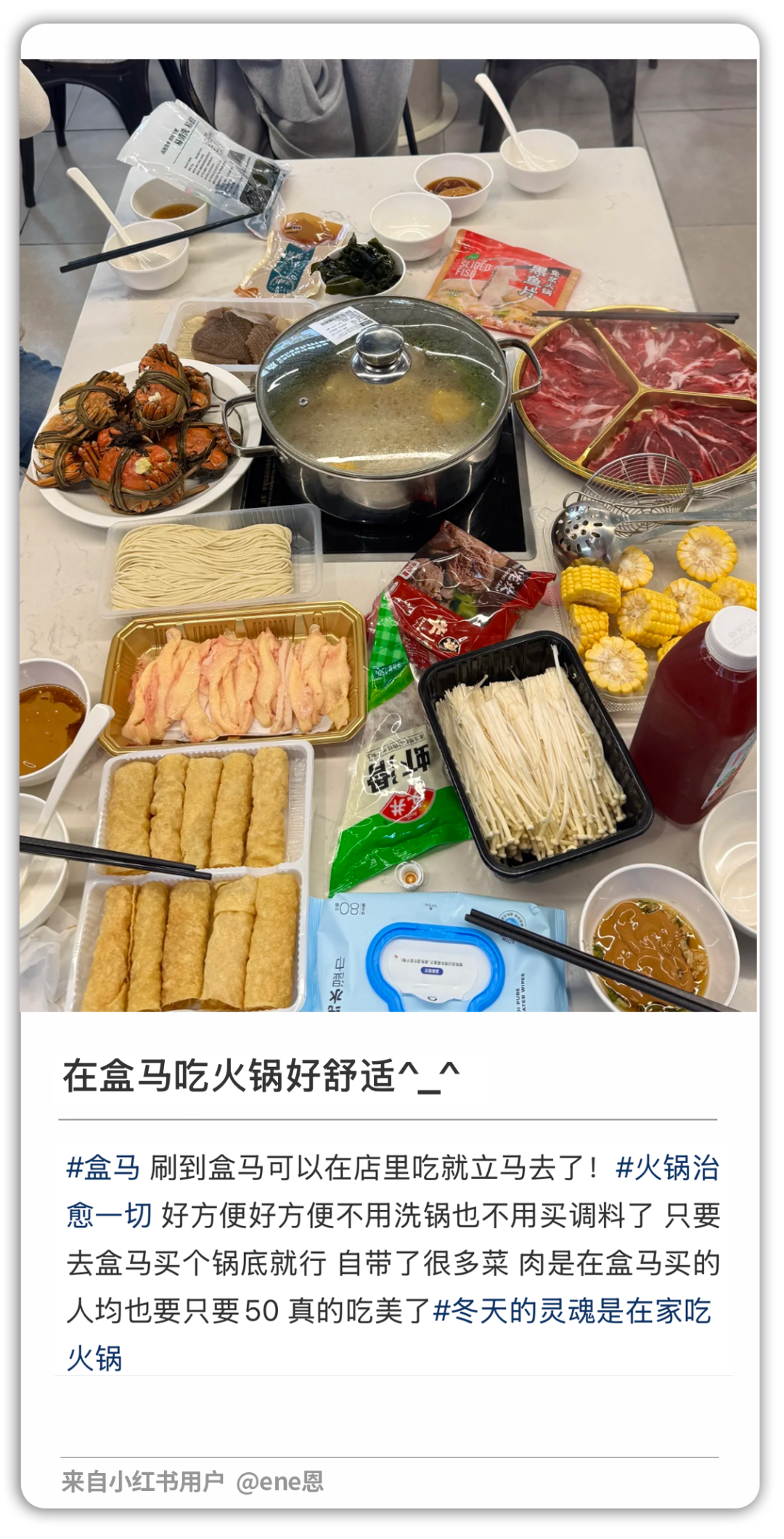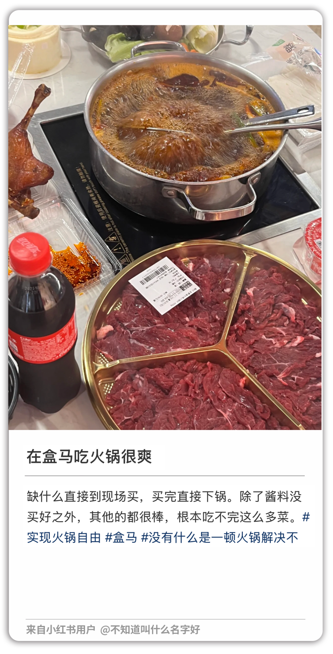 —— 直到我刷到一组“现场直拍图”;三五成群的人,在盒马堂食区,热气袅袅地涮火锅,桌上满满当当地放着我平时去火锅店都不舍得点的各类进口食材。