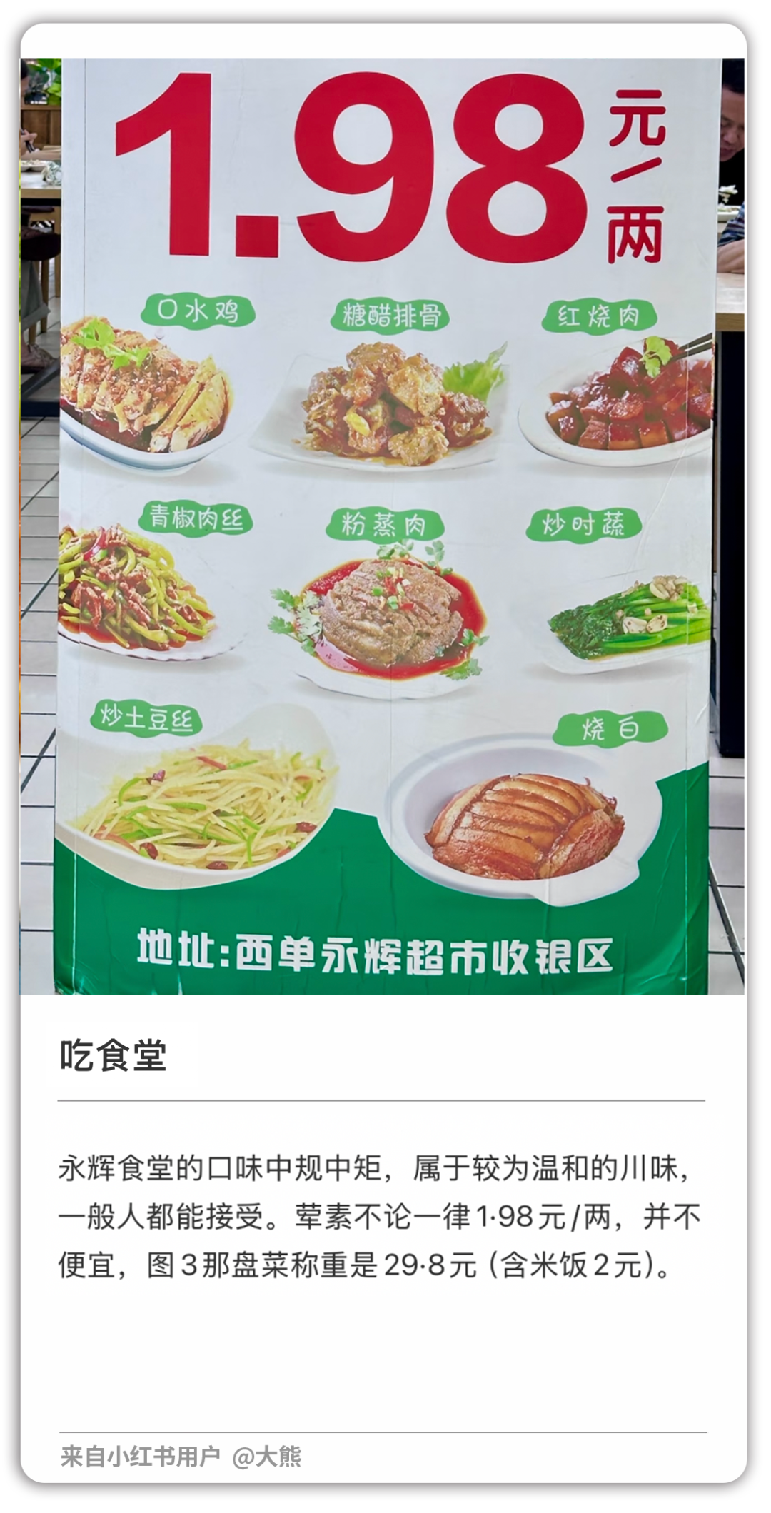 就拿我生活的四川小城来说,去年年底,永辉就在入口最显眼的位置,搞起了按克称重的午餐自助。每天上午11点和下午5点,近20种冷菜、热菜、水果琳琅满目地铺开在保温柜里,每两1.98元,荤素同价。