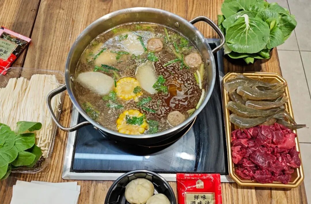 想象一下:下班后,一群饭搭子冲进盒马,推着购物车开启“寻宝模式”——有人直奔熟食区端回咕嘟冒泡的锅底;有人从餐具区捎来碗筷纸巾;还有人顺手把蔬菜区的菠菜拿到洗手池冲一冲;女生利落地剪开虾滑包装,男生撕开肥牛保鲜膜,配合默契得像后厨流水线。最后,“嘭”一声用开瓶器起开冰镇精酿,这不是吃得更尽兴。
