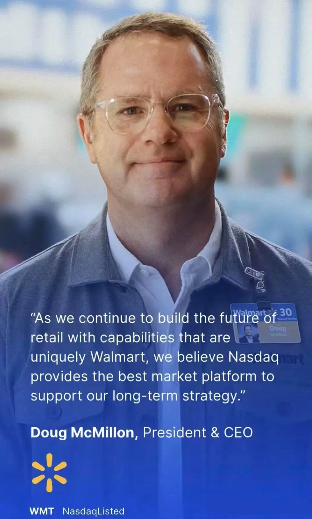 沃尔玛现任CEO董明伦在转板当日表示:“AI 将创造新的购物方式,它将消除购物者不喜欢的摩擦环节,并在他们喜欢的方面加以改善。” 这句话被纳斯达克官方推特置顶,被视为传统零售巨擘向“科技同行”递出的投名状。