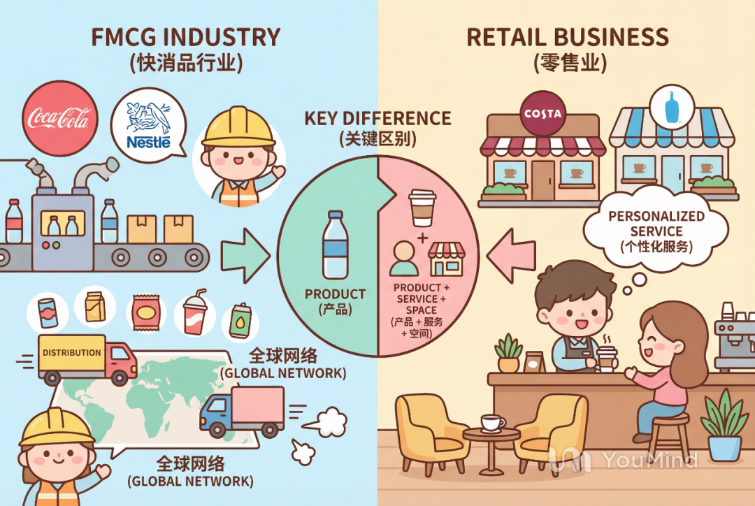快消行业提供的是产品,实体门店提供的是产品+服务+空间,不同的行业需要的能力不同。
