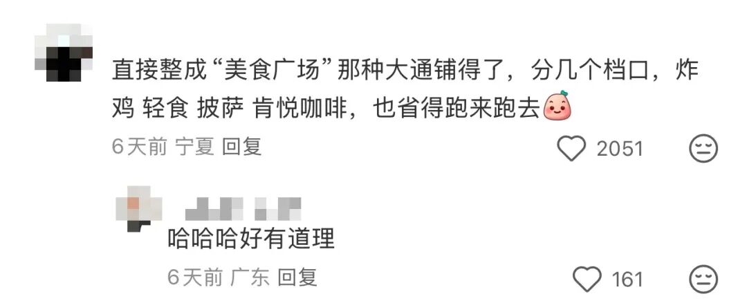 • “直接整成‘美食广场’那种大通铺得了,分几个档口,炸鸡轻食、披萨、肯悦咖啡,也省得跑来跑去。”