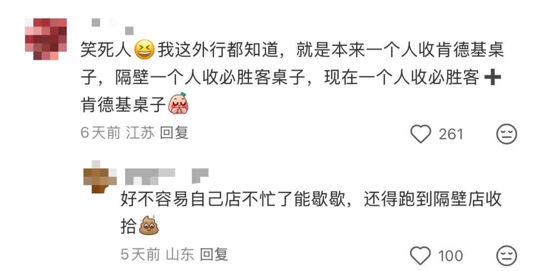 • “笑死人,我这外行都知道,就是本来一个人收肯德基桌子,隔壁一个人收必胜客桌子,现在一个人收必胜客+肯德基桌子。”