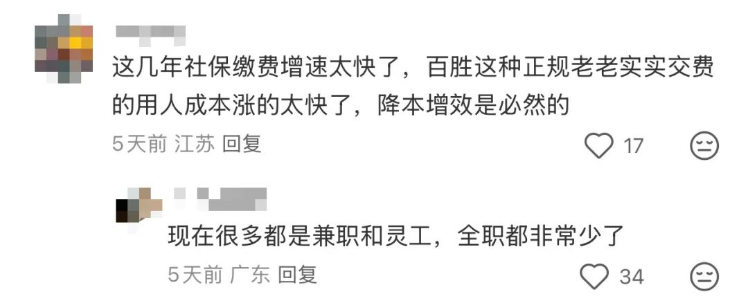 • “这几年社保缴费增速太快了,百胜这种正规老老实实交费的用人成本涨的太快了,降本增效是必然的。”
