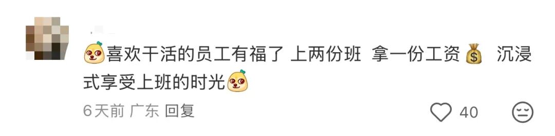 • “喜欢干活的员工有福了,上两份班,拿一份工资,沉浸式享受上班的时光。”