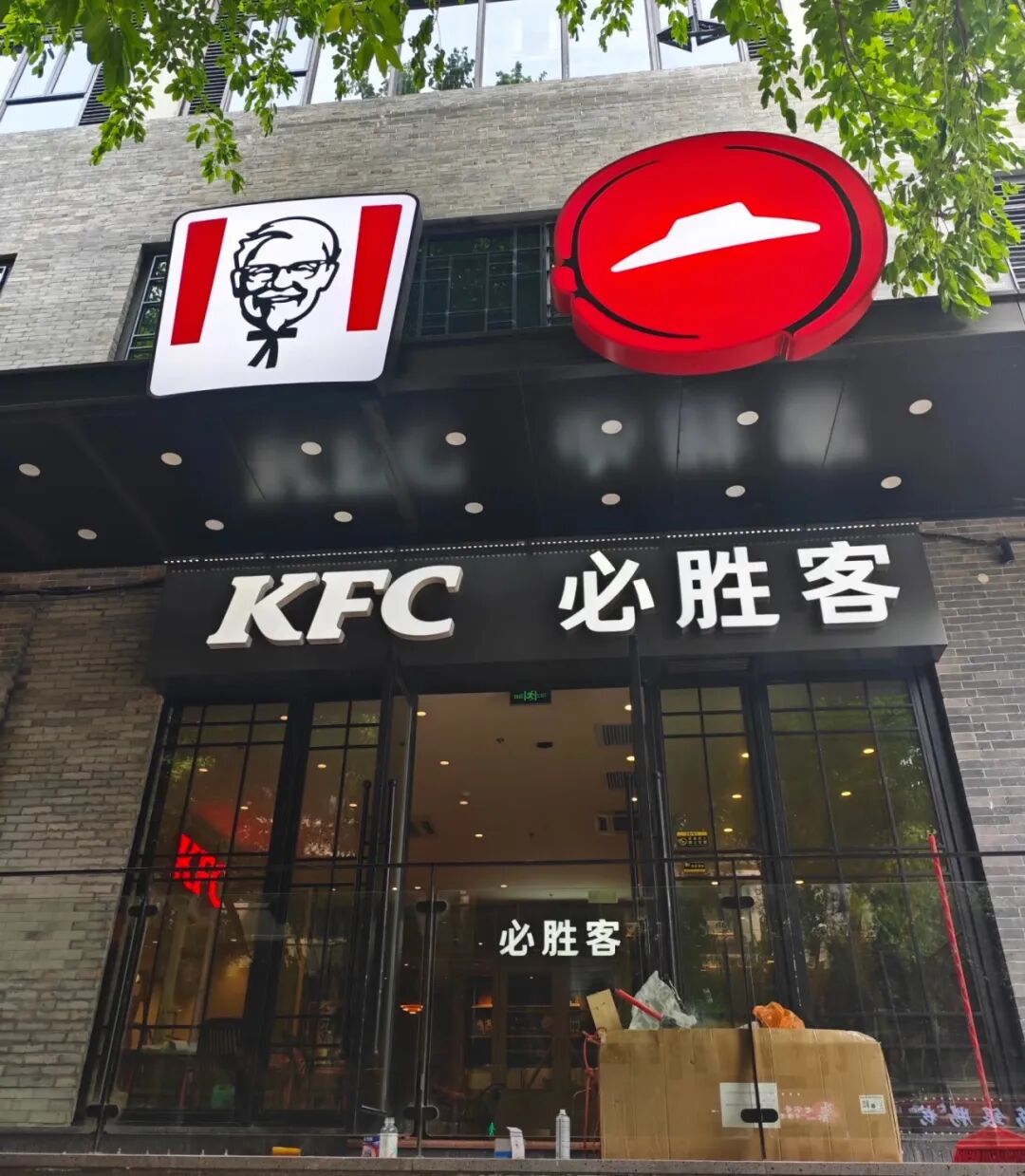 乍一看,是肯德基和必胜客开在一起;再仔细看,才发现不仅是“挨着”,而是同一间店面、同一套后厨、同一批员工,甚至连外卖员取餐的窗口,都是走同一个动线。