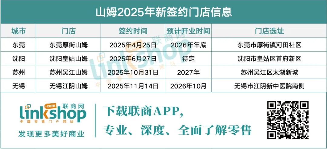 据联商网统计,2025年山姆正式完成签约的新店有4家,分别是东莞厚街山姆、沈阳皇姑山姆、苏州吴江山姆和无锡江阴山姆。