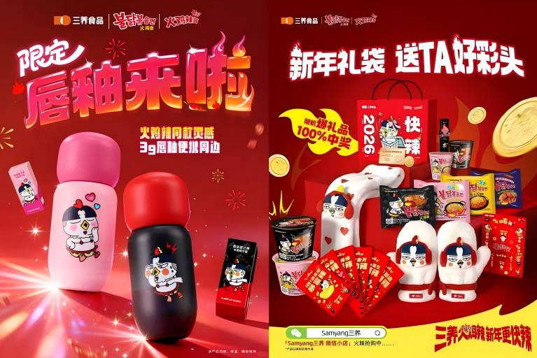品牌还跨界美妆领域,推出“火鸡辣酱同款灵感唇釉”限定赠品,成为一大亮点。这款以火鸡辣酱为灵感的趣味周边,巧妙地将火鸡辣味的感官记忆转化为年轻消费者乐于展示的社交符号。同时,三养食品还围绕春节主题推出金币、红包、对联、围脖等一系列限定周边与礼盒,以兼具设计感与实用性的创意产品,赋予传统年货新鲜感和专属仪式感。这些限定内容通过“微信送礼”线上互动与消费者见面,精准契合线上送礼热潮,让“辣”不再局限于味觉,更成为一份可展示、可互动的数字化社交礼物。
