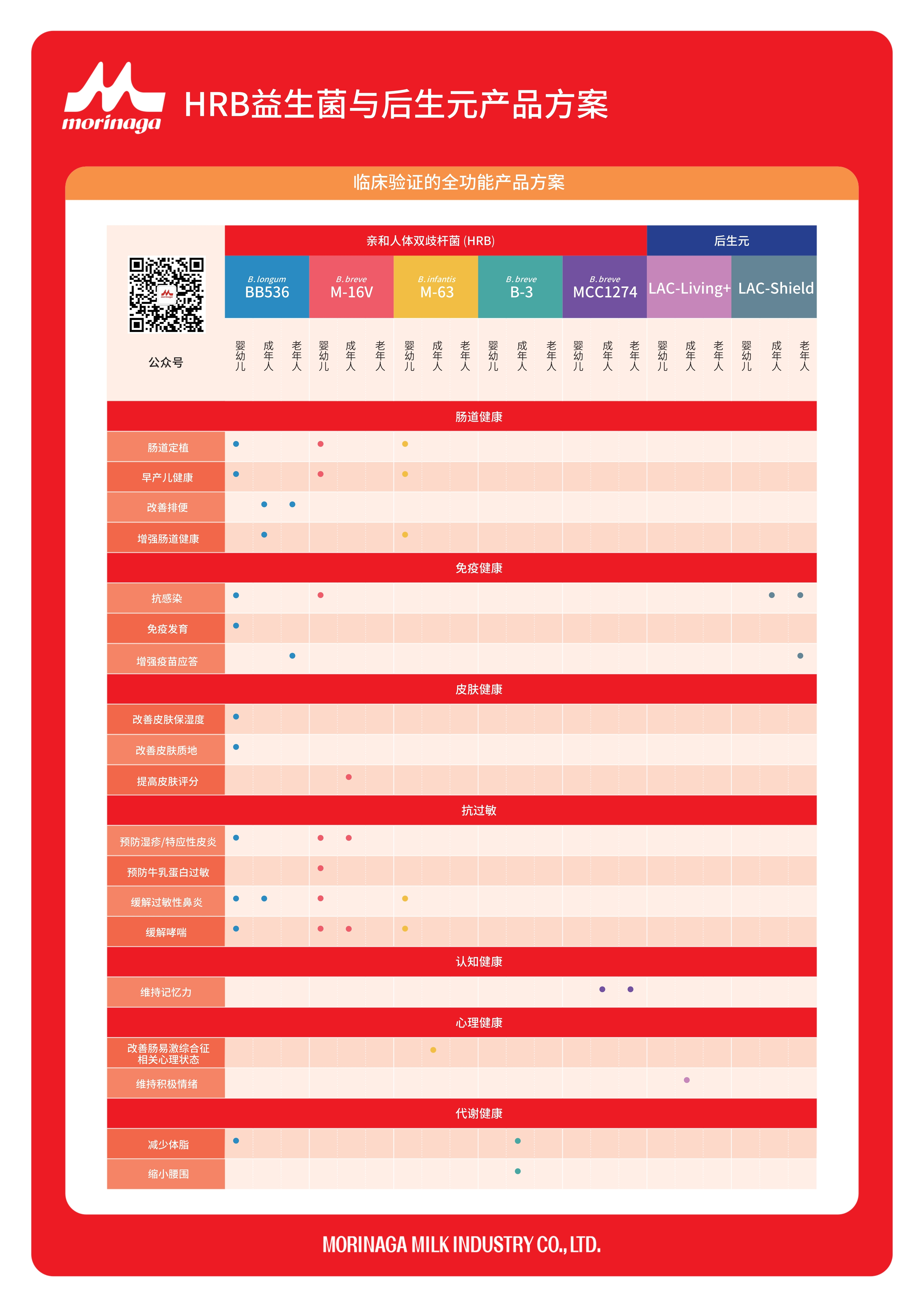 森永乳业在各功能领域均拥有专属特色菌株,核心菌株包含BB536®、M-16V®、M-63、B-3、Brainbifi®MCC1274,同时布局后生元品类LAC-Shield®、LAC-Living+™,菌株及后生元矩阵覆盖肠道健康、免疫健康、过敏调节、体重管理、认知改善等多个功能领域。