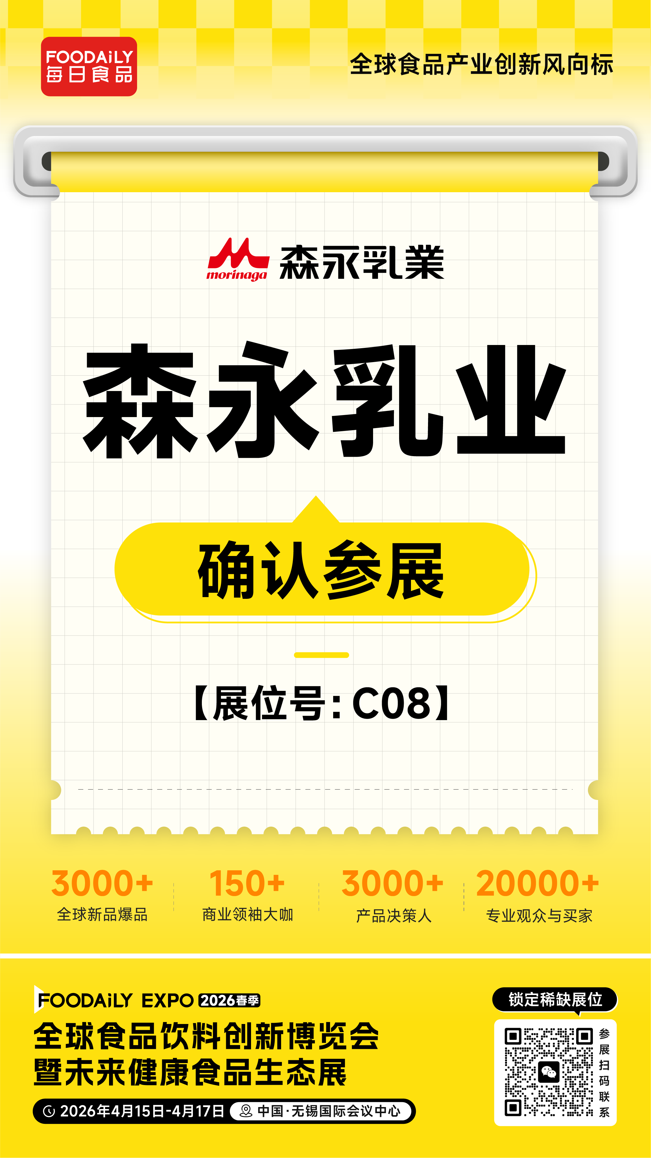 森永乳业,一家以乳为基、深耕美味与健康百年的全球知名乳制品企业。品牌秉持「为了更灿烂的“笑容”」的初心,以尖端乳科技为支撑,在“美味享受”与“健康滋养”之间寻求极致平衡,用每一款产品传递对生活的热爱与守护。2026 Foodaily创新博览会,森永乳业将携旗下明星产品矩阵亮相于无锡国际会议中心,C08展位,邀业界同仁共探乳制品创新方向,共启健康食品新未来!