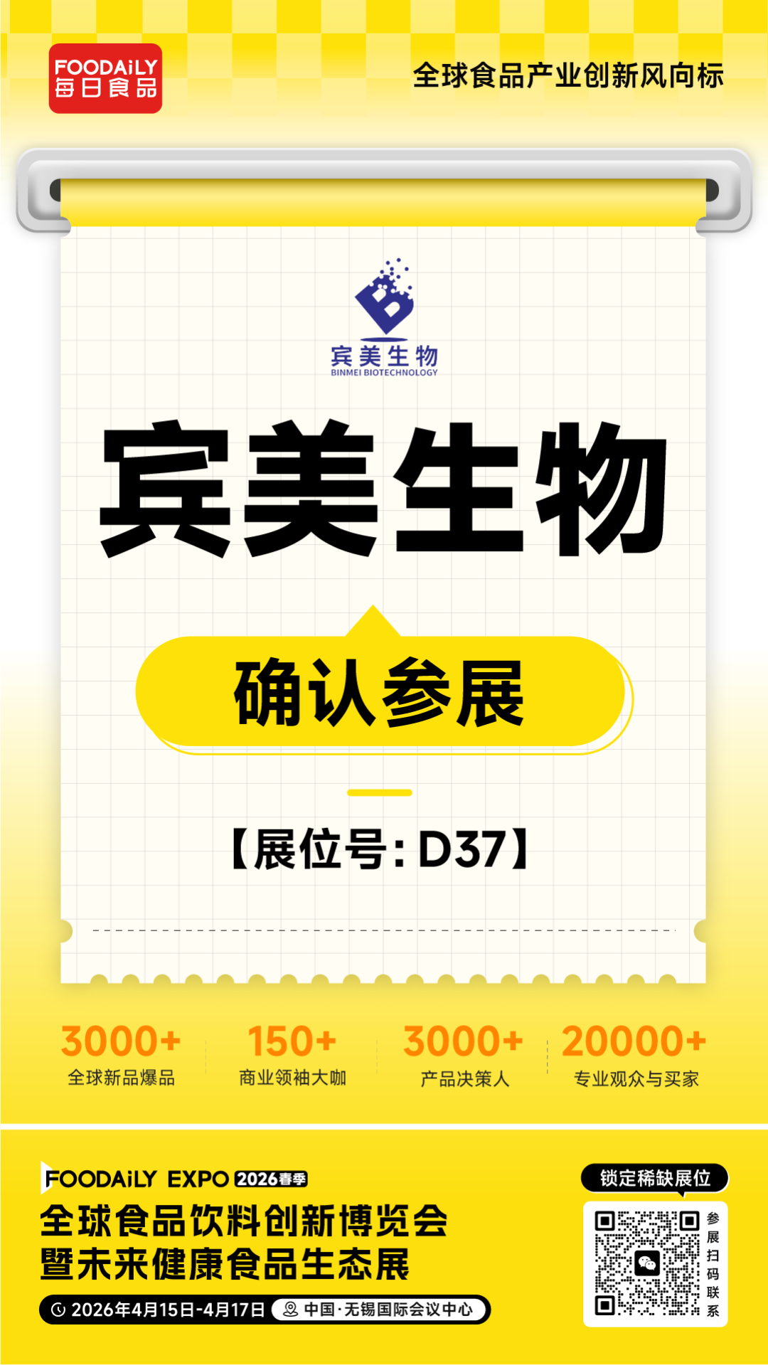 2026 Foodaily创新博览会,宾美生物将携旗下多元天然原料产品矩阵亮相无锡国际会议中心,D37展位,诚邀业界同仁莅临交流,共探天然食品原料的创新应用方向,共启食品行业天然化、健康化发展新未来!