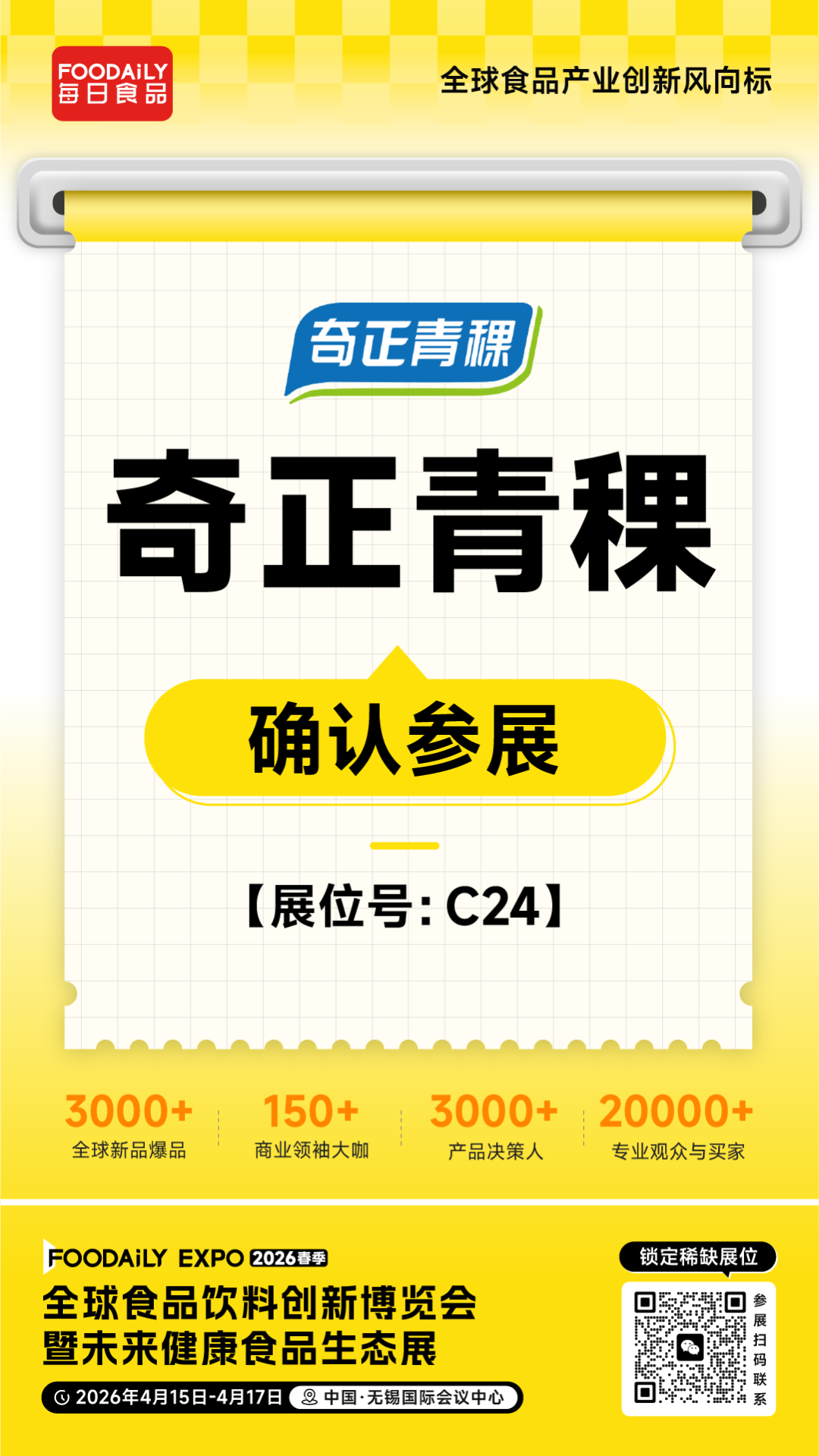 2026 Foodaily 创新博览会,奇正青稞将携旗下特色产品亮相于无锡国际会议中心,C24展位,邀业界同仁共探青稞食品创新赛道,共拓健康饮食新可能!