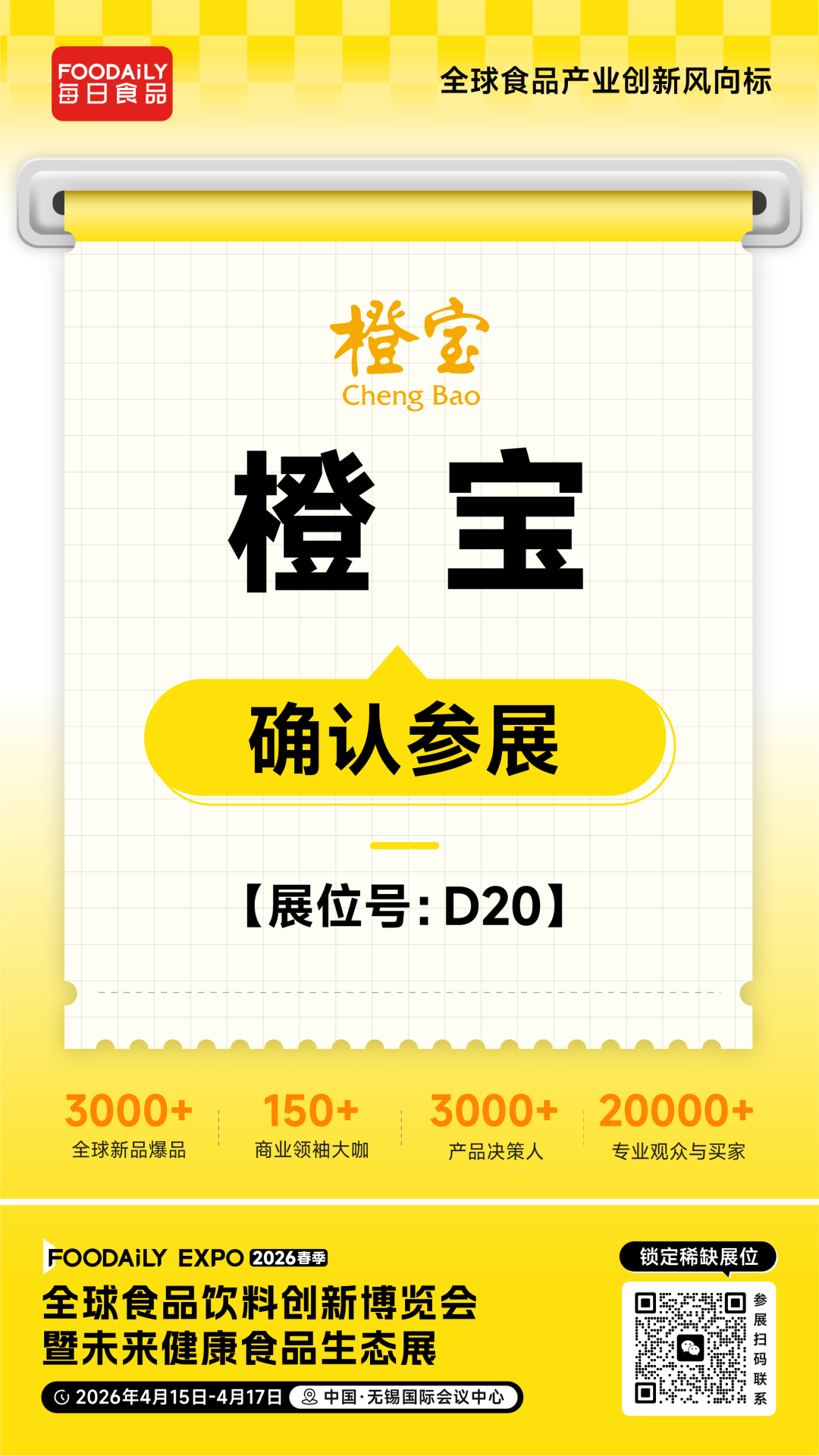 2026 Foodaily创新博览会,橙宝将携旗下创新产品矩阵亮相于无锡国际会议中心,D20展位,以纯粹好果汁与业界同仁共探饮品发展新可能。