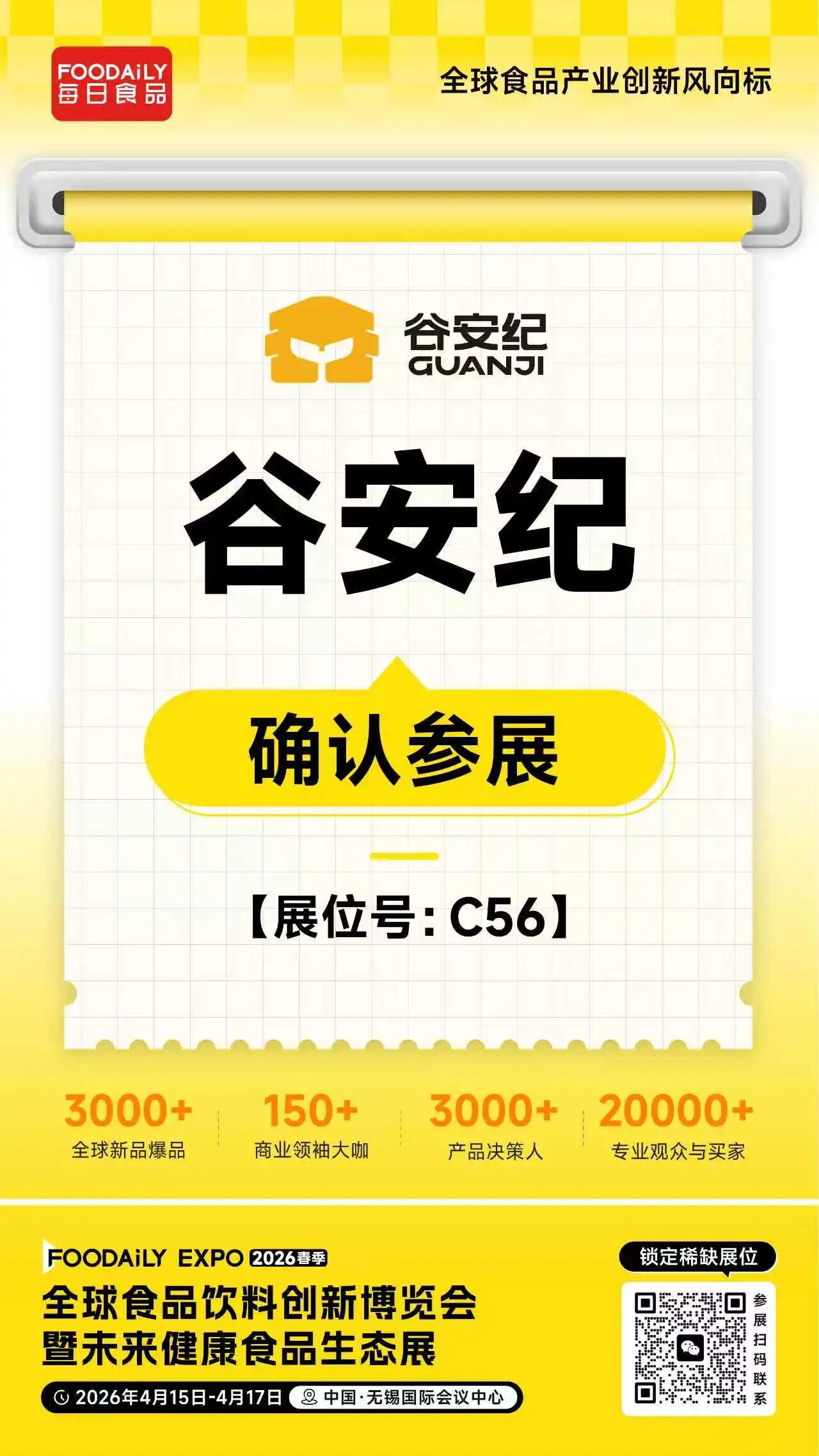 2026 Foodaily创新博览会,谷安纪将携旗下核心产品亮相于无锡国际会议中心,C56展位,邀业界同仁共探健康主食创新发展,共启轻卡主食新征程!