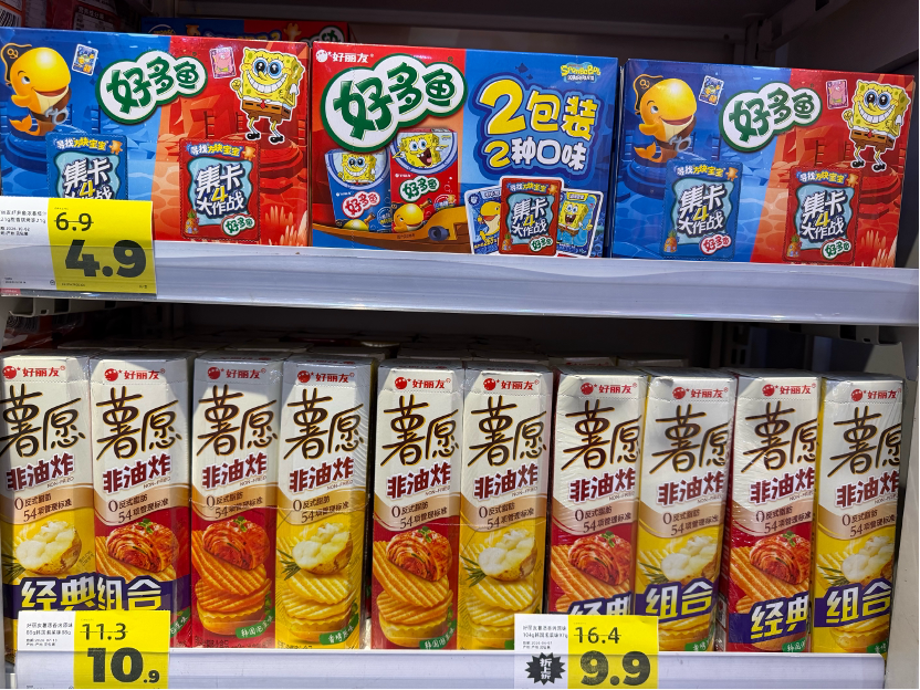 在此背景下,好丽友也进一步明确了其在华下一步布局方向。公司表示,将继续推出新的健康产品,同时扩大面向高增长渠道的专属产品供给;瞄准杭州、广州等中国中南部高增长城市,加大在零食量贩店和便利店渠道的拓展力度。今天,小食代在广州一家好特卖门店看到,多款好丽友产品有售,包括了“基本盘”派、蘑菇力、好多鱼、薯愿、呀!土豆等,不少产品售价比标称的原价低了近三分之一。