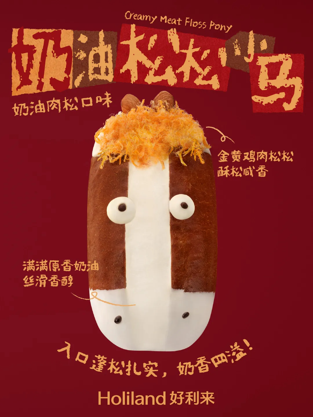 近日,好利来推出「奶油松松小马」新品。据官方介绍,该新品为奶油肉松口味面包,采用原香奶油制作,并添加酥松咸香的鸡肉松。