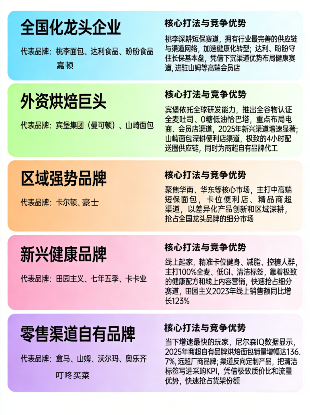 这一阶段的核心关键词是 “健康”。消费需求从 “新鲜” 向 “健康” 全面升级,清洁标签、全麦、低 GI 成为行业核心赛道,市场玩家从传统的 “二元对立”,彻底进入 “五梯队多元混战” 的新格局,新老玩家同台竞技,行业洗牌加速。