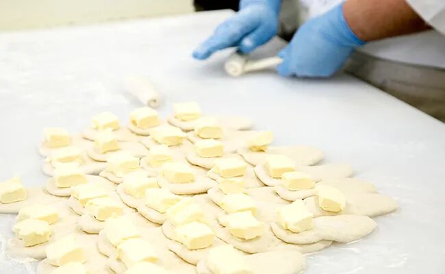 Pain Masion 的盐面包是 50g 面团裹入 10g 黄油(相当于面团克重 20% 的黄油),因此烘烤时黄油会融化并溢至面团底部,形成内部组织的空心结构,赋予底部焦香酥脆的油煎质地。