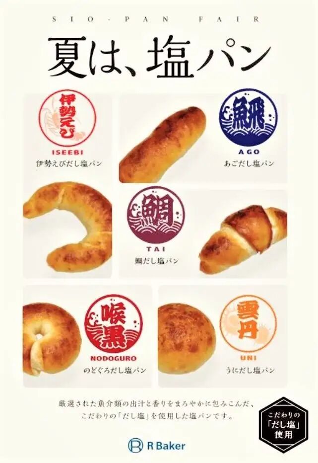 比如连锁烘焙咖啡店「R Baker」2023 年举办了为期一个多月的盐面包节,限时供应 5 款使用海鲜高汤盐制作的盐面包,据称融合了海鲜的鲜味和咸味,是炎炎夏日补充盐分的理想之选,倒是和上了盐面包诞生的初衷😂~