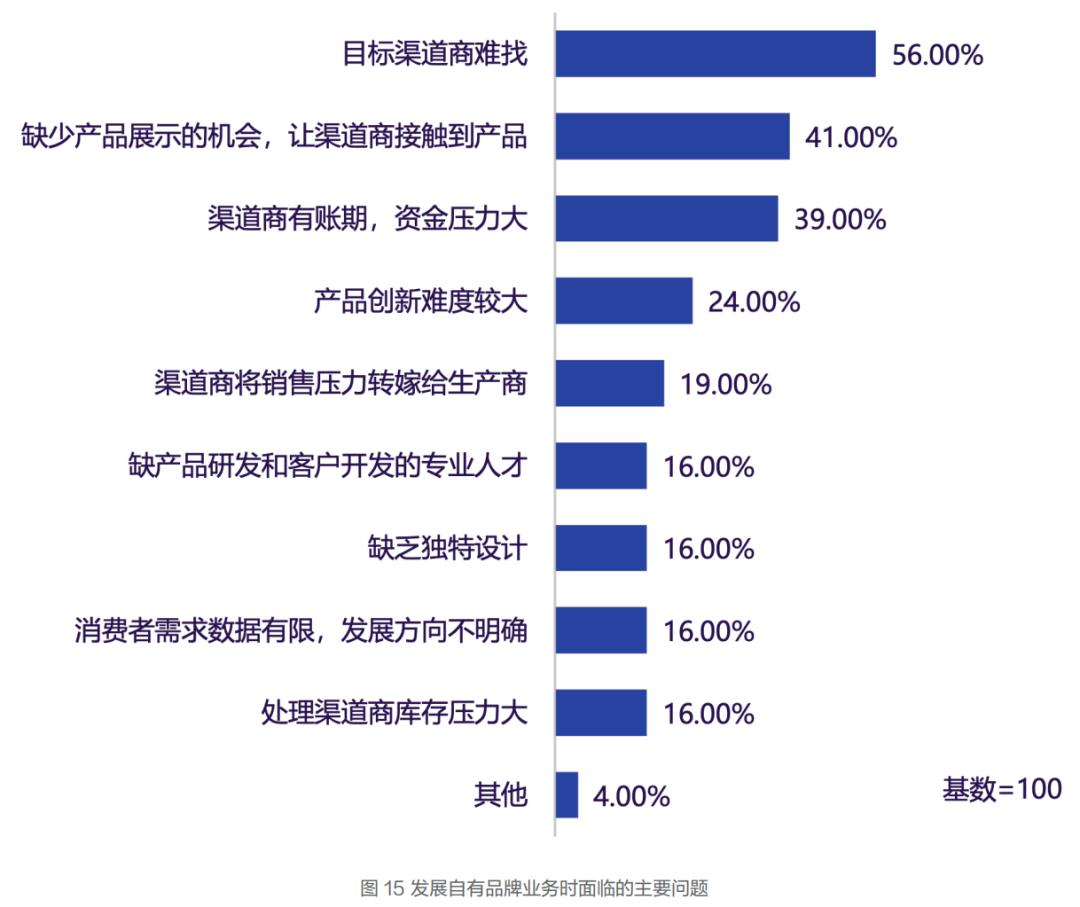 报告显示,供应商开发自有品牌业务,面临的首要难题是“目标渠道难找”,根本找不到相关零售客户;其次是“缺少产品展示机会”,即便联系上了零售商,也缺乏向其展示自家产品的机会;再次是“渠道商有账期,资金压力大”。