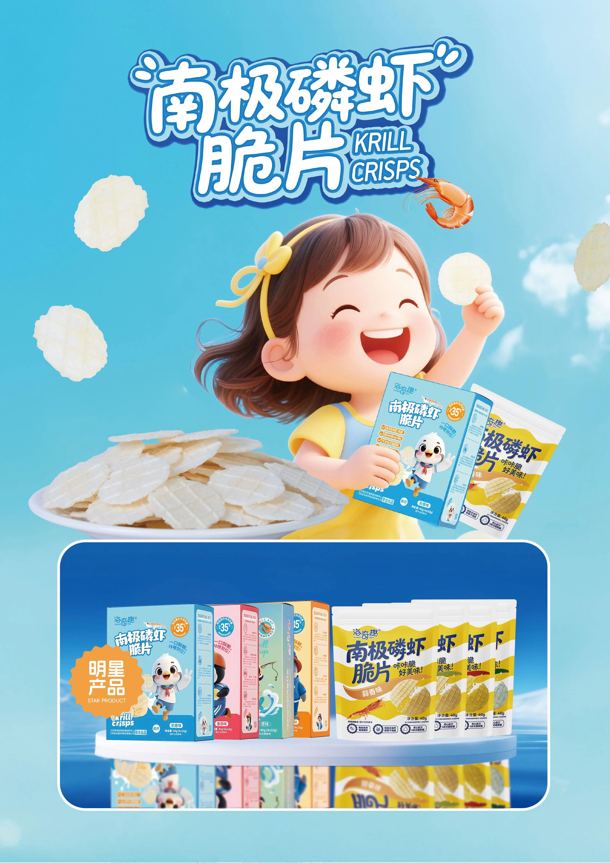 产品联合江南大学科研力量攻关关键技术,选用南极纯净海域富含Omega-3的南极磷虾为原料,虾肉添加量高达35%,经非油炸工艺锁住磷虾本味,配料干净无额外添加。